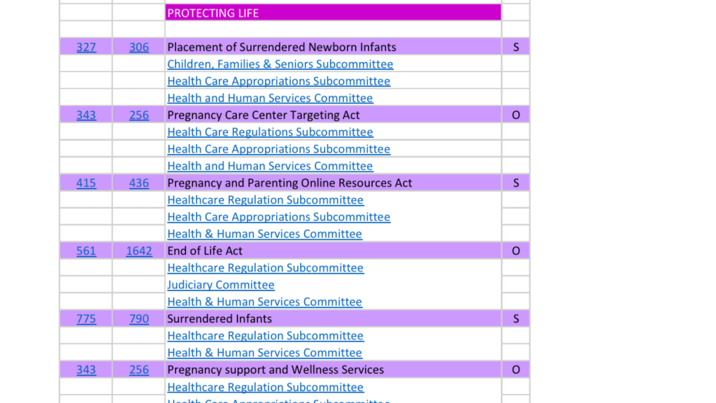 We have prepared a “Legislative Spreadsheet” with the specific bills organized by category. We have Dignity of Life, Parental Rights, Gender and Sexuality issues, Pornography, etc. There are from three to ten bills laid out in each category along with columns that track the bills progress through the process. It looks challenging but is pretty easy to follow. What we need is for folks to pick a category and get up to speed on the several bills in each category, then contact the legislators by email or by phone to tell them that you support or oppose the particular bills. You have no idea how important it is to communicate our wishes to those who may be wavering!