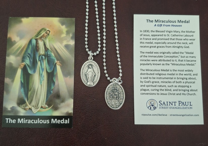 A year or two ago, we dedicated our work to the Immaculate Conception and began giving away prayer cards and blessed miraculous medals on a simple chain to anyone who wanted them. We have given them to waitresses, retail clerks, students, penitents in the confession line, friends, travelers, and nursing home residents to name a few. We carry them with us always, ready for the inspiration of the Holy Spirit to offer them to people. We give them away one by one, in larger quantities as needed, however the situation presents.
